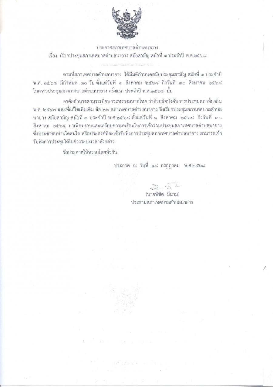 สภาเทศบาลตำบลนายาง กำหนดประชุมสภาเทศบาลตำบลนายาง สมัยสามัญ สมัยที่ 3 ประจำปี 2568 ในวันที่ 1สิงหาคม 2568 ตั้งแต่เวลา 10.00 น. เป็นต้นไป