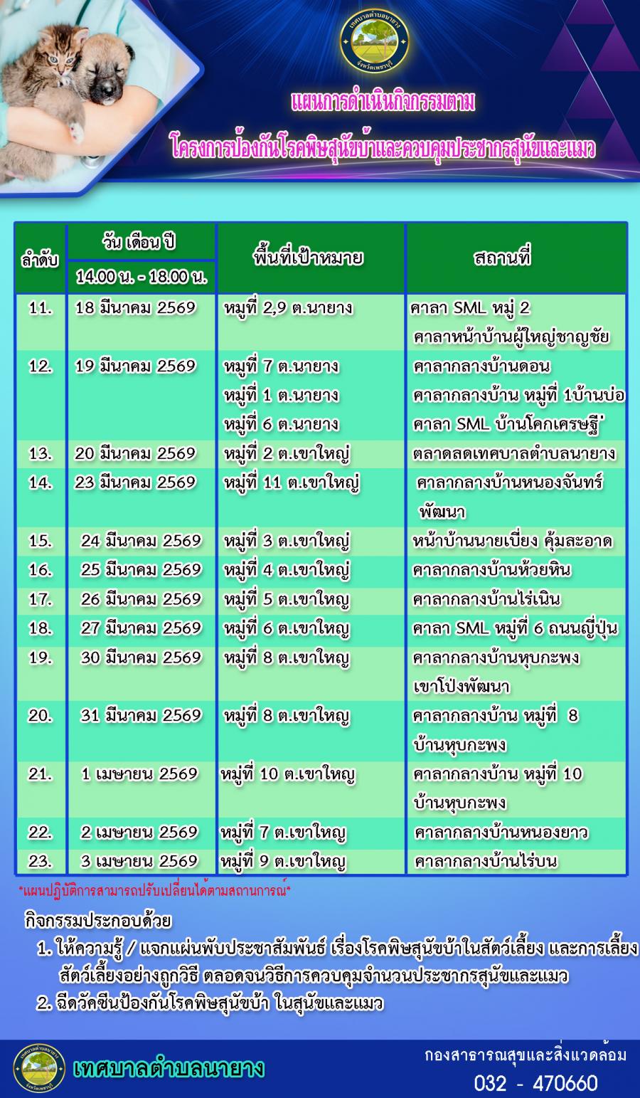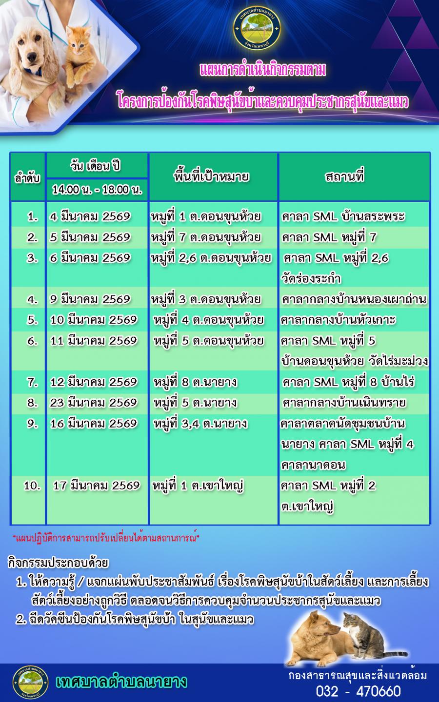 กองสาธารณสุขและสิ่งแวดล้อม เทศบาลตำบลนายาง จะออกบริการฉีดวัคซีนป้องกันโรคพิษสุนัขบ้า ให้กับ สุนัขและแมว ให้กับประชาชน ตามเวลาและสถานที่ ที่แจ้งรายละัเอียดจากรูปภาพ